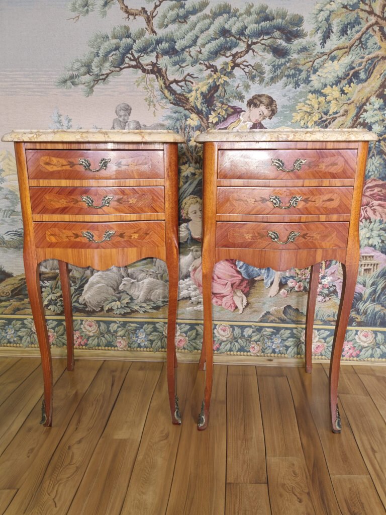 Bring the elegance of 18th-century France into your interiors with this exquisite pair of Louis XV marquetry french antique nightstands, crafted in rich mahogany and topped with luxurious marble.